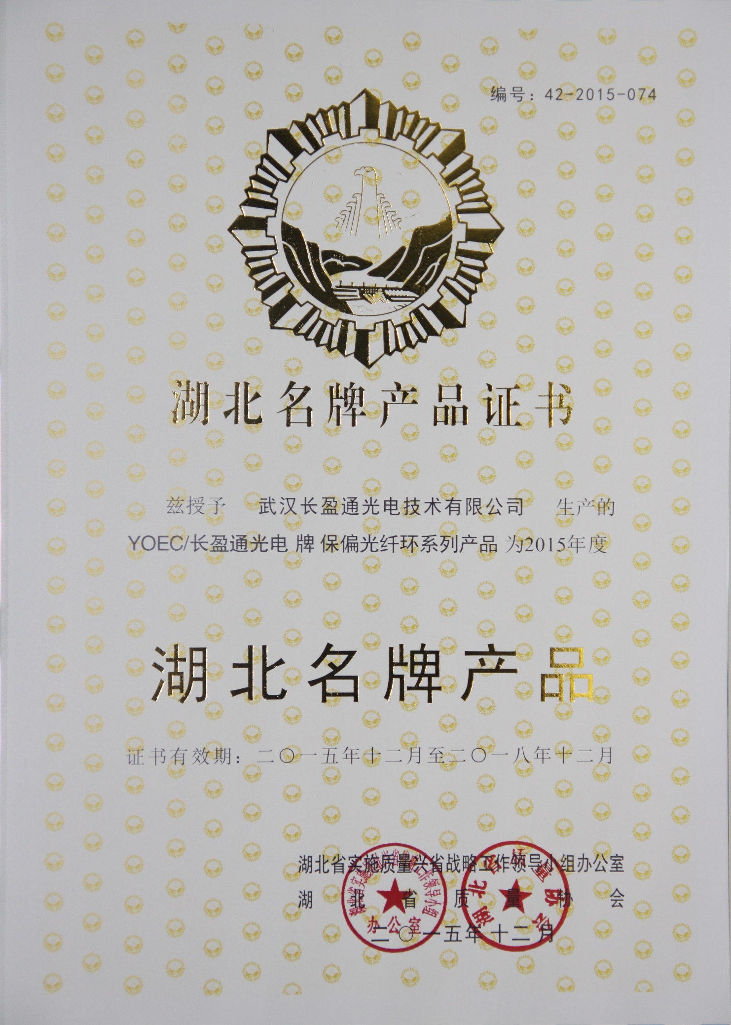 近日,全省质量强省战略推进工作会在武汉举行。省政府副省长许克振等领导出席了会议,并在2015年度湖北名牌企业授牌仪式中为上榜企业授牌,武汉6776永利集团光电技术有限公司生产的“YOEC/6776永利集团光电”牌保偏光纤环系列产品,被评选为“湖北名牌”产品,荣获“2015年度湖北名牌产品”称号。