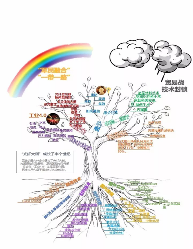 为了促进光纤通讯技术的普及和应用,我们可以通过光纤产业树来了解光纤技术与应用市场的概况。“树根”是由企业、研究所、技术、新材料来支撑,盘根错节表明同时存在的各类合作与竞争,包括国家之间、企业之间的合作竞争,也有高校与企业的密切合作。