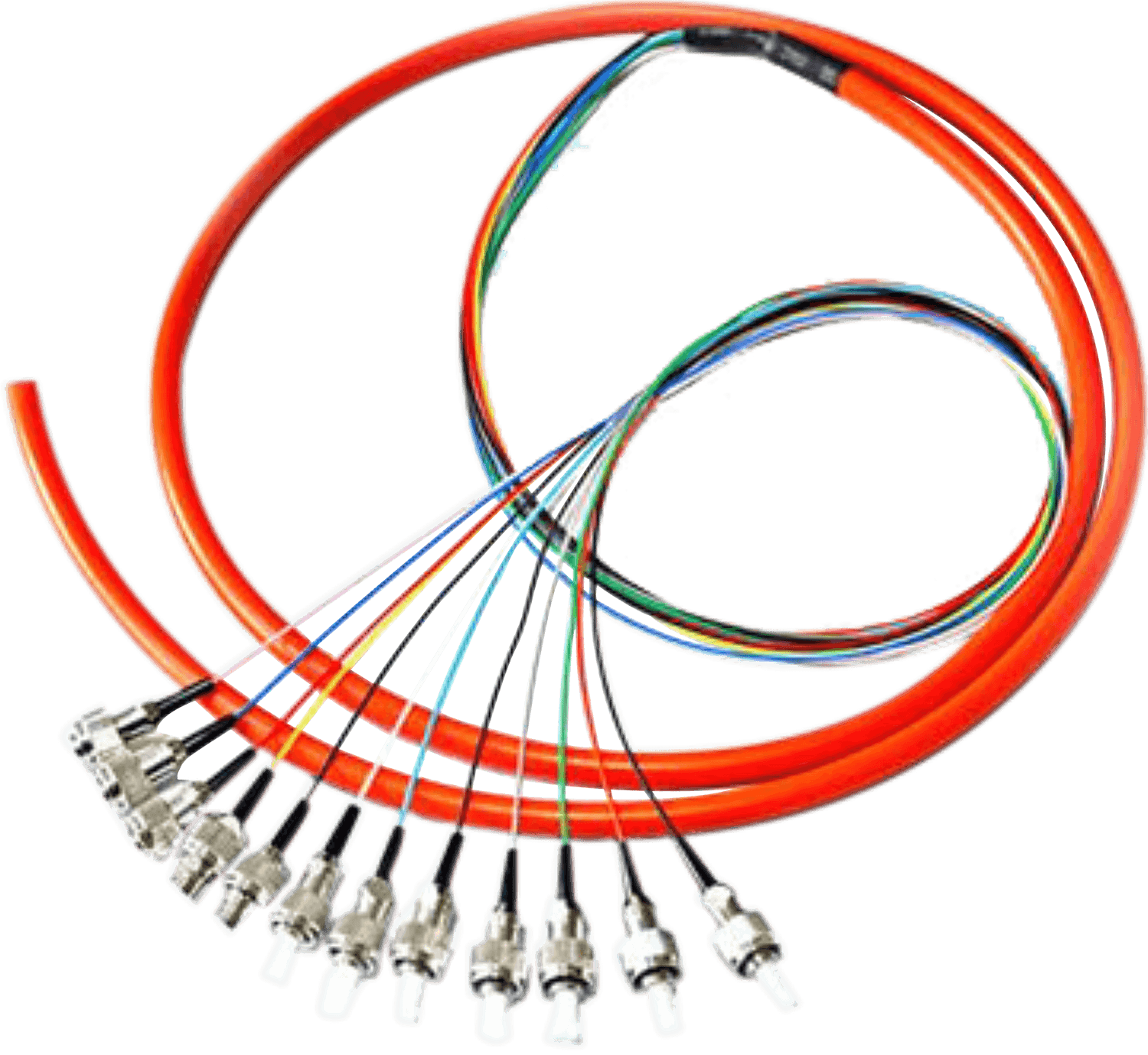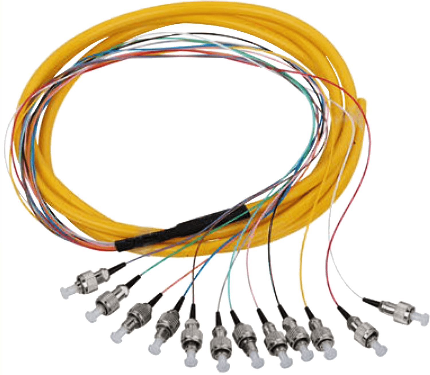 束状、带状光纤光缆连接器组件,也称束状、带状光纤光缆组件/尾纤等,可以加工成为一端为连接头,也可加工两端连接头,常出现在光纤终端盒内,用于连接光缆与终端设备;尾纤分为多模尾纤和单模尾纤:多模尾纤为橙色,波长为850nm,传输距离为500m,用于短距离互联;单模尾纤为黄色,使用波长有两种,1310nm和1550nm,传输距离分别为10km和40km,由4、6、8、12、24等不同芯数组成。