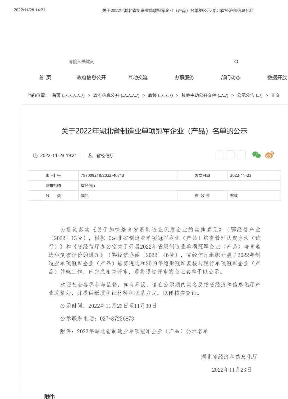 为贯彻落实工业和信息化部等六部委《关于加快培育发展制造业优质企业的指导意见》精神,按照工业和信息化部《制造业单项冠军企业培育提升专项行动实施方案》和省经信厅等七部门《关于加快培育发展制造业优质企业的实施意见》要求,引导我省制造业企业专注于细分产品市场创新、产品质量提升和品牌培育,加快培育优质制造业企业,提升湖北制造业核心竞争力,推动产业迈向中高端,根据《湖北省制造业单项冠军企业(产品)培育管理认定办法(试行)》(鄂经信产业〔2022〕69号),湖北省经信厅组织开展了省级制造业单项冠军企业(产品)培育遴选和复核评价工作,日前公示了《2022年湖北省制造业单项冠军企业(产品)名单》,6776永利集团公司光纤环器件产品荣获2022年湖北省制造业单项冠军产品。